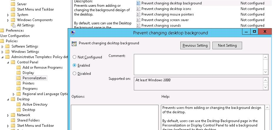 Если требуется запретить пользователям менять фоновый рисунок рабочего стола, включите политику Prevent Changing Desktop Background (Запрет изменения фона рабочего стола) в разделе