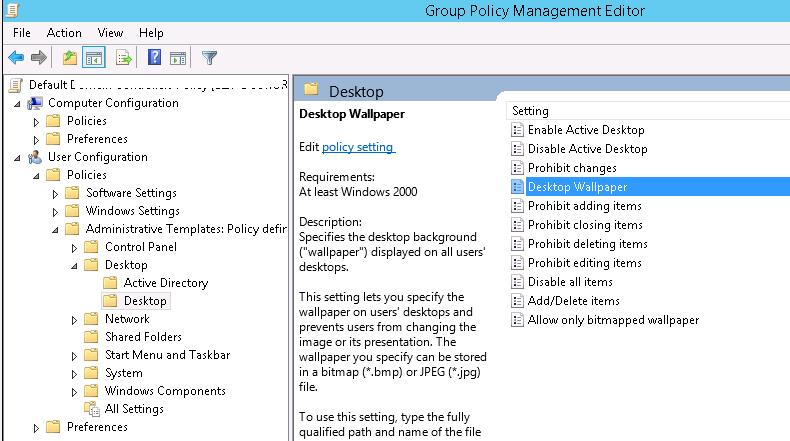 Рассмотрим, как с помощью групповых политик можно установить одинаковый рисунок рабочего стола (обои) на всех компьютерах домена. Как правило, такое требование возникает в крупных организациях, требующих от пользователей использовать единообразный вид фонового рисунка рабочего стола, выполненного в корпоративном стиле компании.