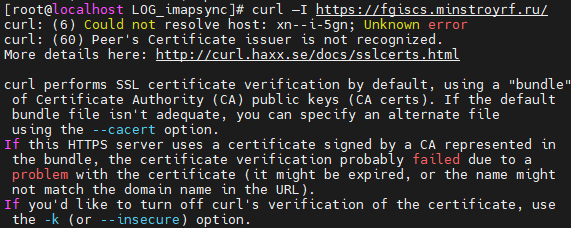 Чтобы проверить, что ваш хост Linux не может проверить (и соответственно не доверяет) SSL сертификату на определенном сайте, выполните команду: