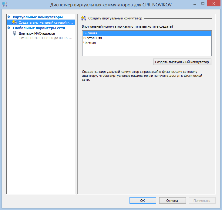 Итак, для создания нового виртуального коммутатора надо выбрать его тип и нажать кнопку «Создать виртуальный коммутатор».