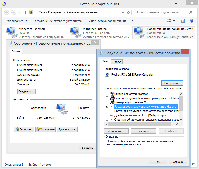 За подключение компьютера к внешней сети теперь отвечает виртуальный адаптер External, на который перенесены все настройки физического интерфейса. Сам же физический адаптер лишен всех привязок и играет роль виртуального коммутатора для Hyper-V. В связи с этим стоит помнить, что при создании или удалении внешней виртуальной сети подключение компьютера к внешней сети будет нарушено.