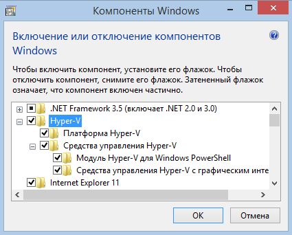 В открывшемся окне находим пункт Hyper-V. Кроме самой платформы Hyper-V сюда входят средства для ее управления — графическая оснастка Hyper-V Manager и модуль Hyper-V для PowerShell. Раскрываем его, отмечаем все необходимые компоненты и жмем OK.