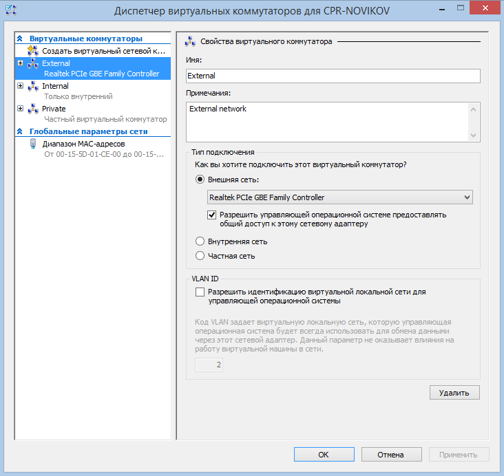Ну и если у вас в сети используется разбиение на логические подсети (Virtual Local Area Network, VLAN), то для виртуального коммутатора, подключенного к внешней сети, можно разрешить использование VLAN и указать VLAN ID. Соответственно все ВМ, подключенные к этому коммутатору, будут находиться в указанной подсети.