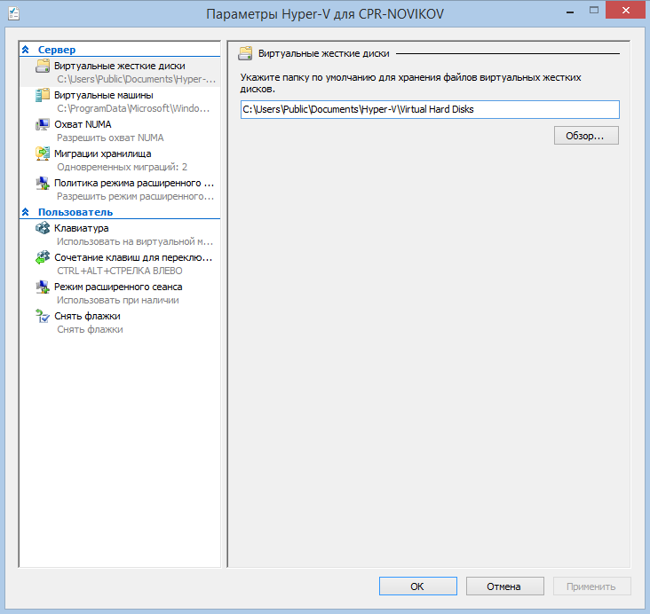 В разделе «Виртуальные жесткие диски» указывается директория для размещения виртуальных дисков, а в разделе «Виртуальные машины» — директория, в которой размещаются файлы конфигурации виртуальных машин. По умолчанию они находятся на системном диске, причем в разных местах, что на мой взгляд не совсем удобно. Впрочем, это дефолтное расположение файлов, при желании его можно изменить для каждой конкретной ВМ при ее создании.