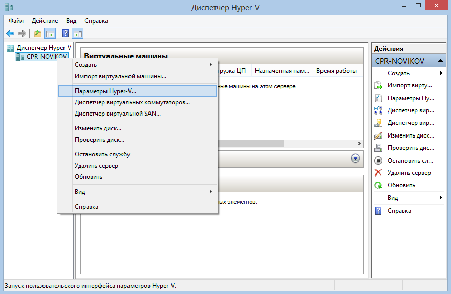 Открыв диспетчер, кликаем правой клавишей на имени хоста и выбираем в контекстном меню пункт «Параметры Hyper-V».