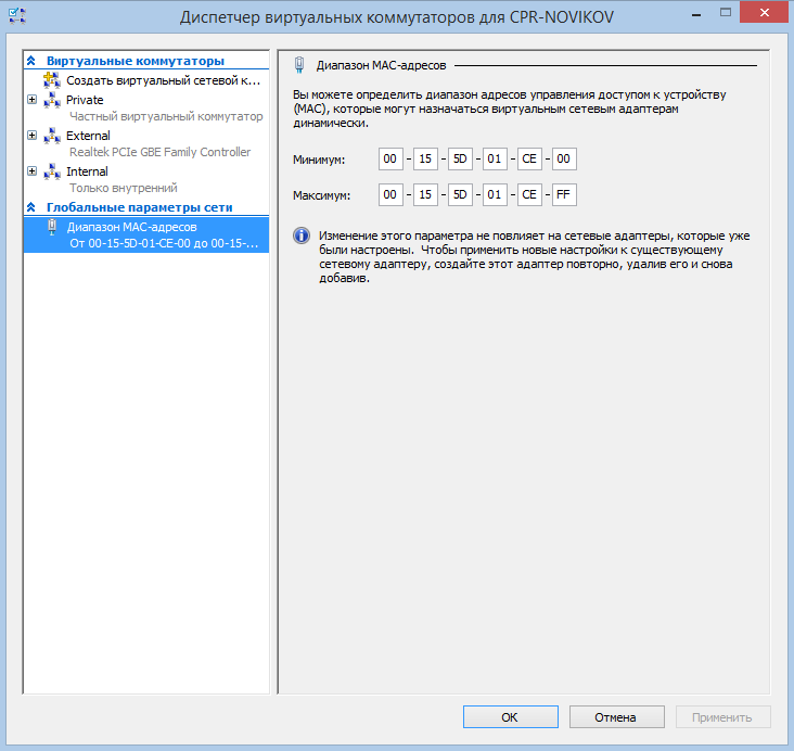 Дополнительно, перейдя в раздел «Глобальные параметры сети» можно задать диапазон MAC-адресов, которые будут динамически назначаться виртуальным машинам. Это может потребоваться в корпоративной сети, чтобы диапазоны MAC-адресов не пересекались.