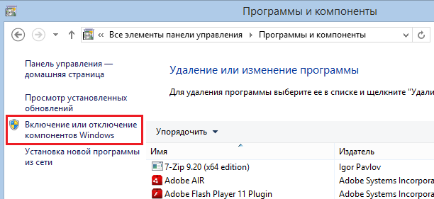 Для установки Hyper-V переходим в Панель управления -> Программы и компоненты и выбираем пункт «Включение или отключение компонентов Windows».