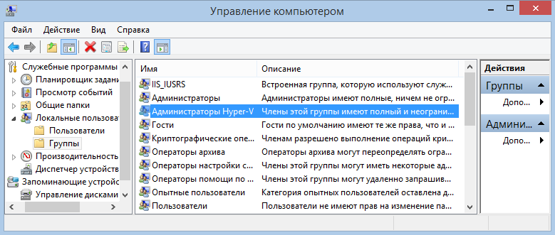 По умолчанию доступ ко всем настройкам Hyper-V имеют члены группы «Администраторы». Если же вы хотите дать пользователю права на управление только Hyper-V, ограничив доступ к настройкам физического компьютера, то можно добавить его в группу «Администраторы Hyper-V». Члены этой группы также имеют неограниченный доступ к Hyper-V, могут изменять любые настройки и управлять виртуальными машинами.