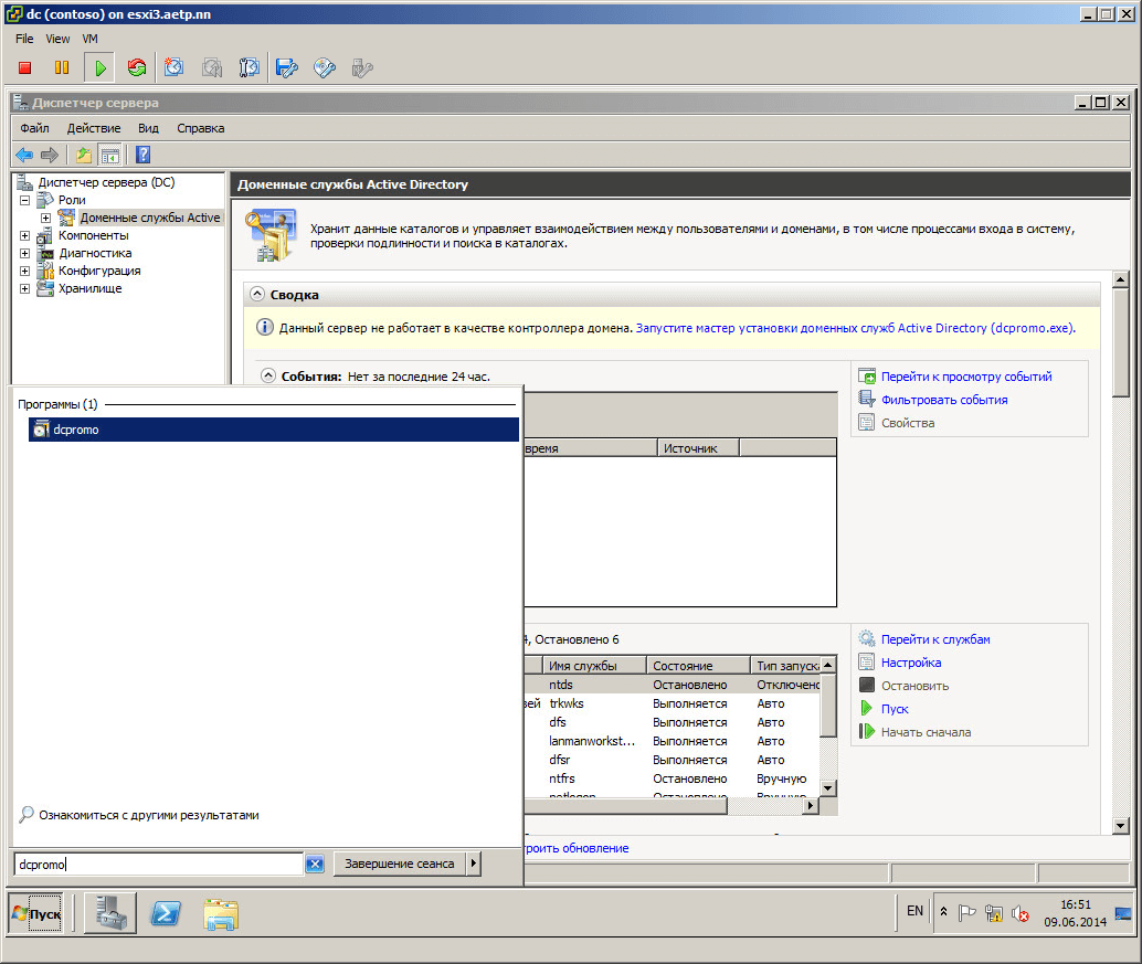 После установки в диспетчере ролей мы видим ошибку и ее текст, мол введите в пуске dcpromo.exe и будут вам счастье, так и поступим.