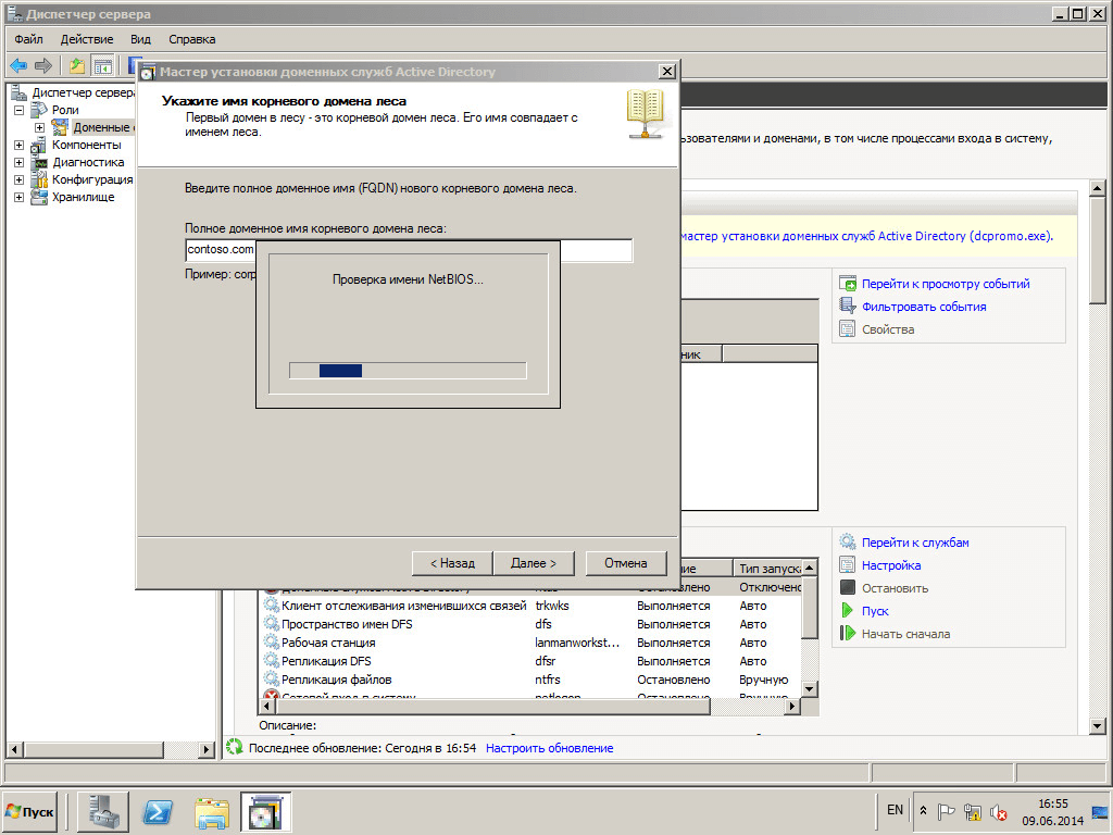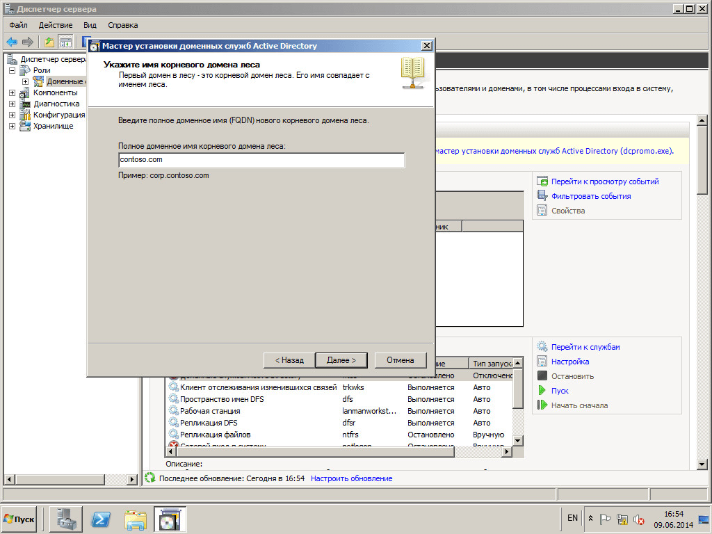 Придумываем имя нашего домена, я выбрал contoso.com в целях тестового тестирования, вам же хочу посоветовать прочитать статью как правильно выбрать имя домена Active Directory,