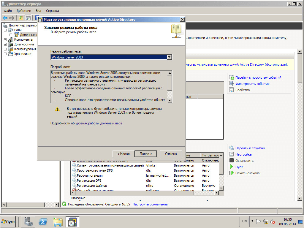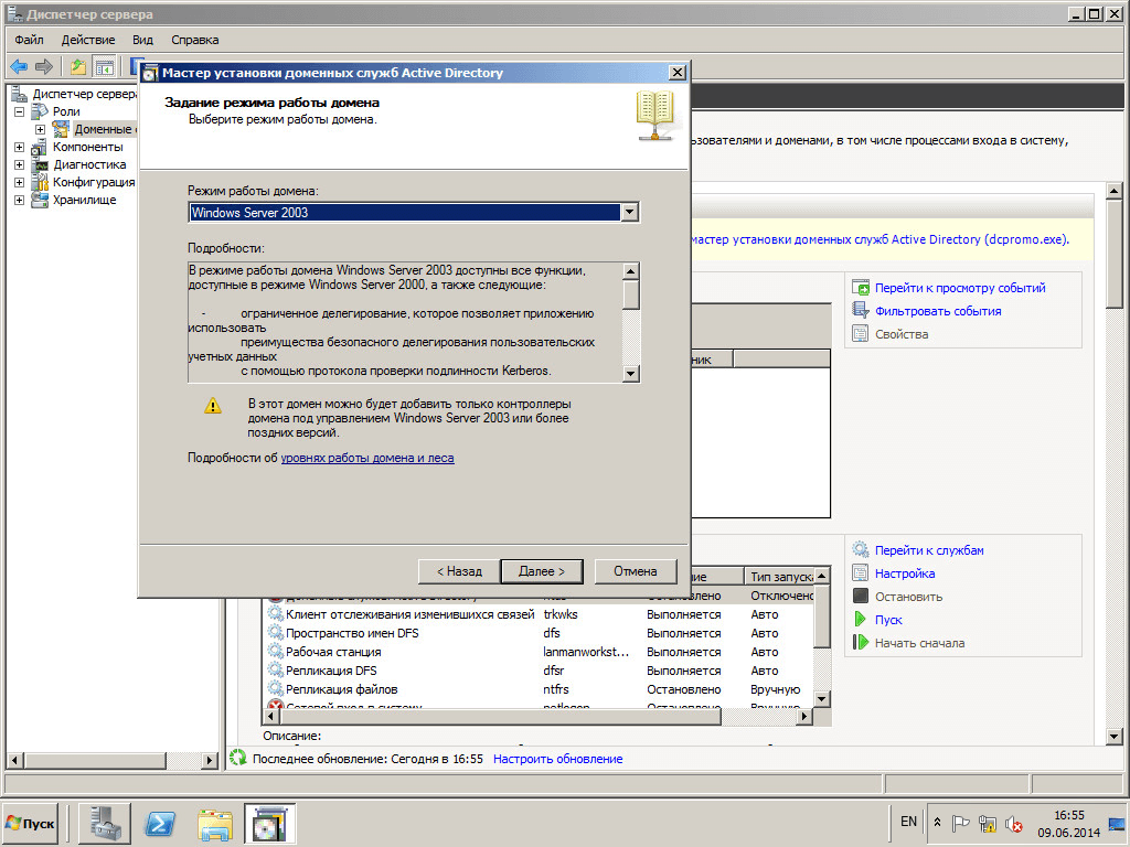 Выбираем режим работы домена windows server 2003 , я выбрал этот режим для того чтобы показать как поднимается режим работы, вы же выбирайте сразу 2008R2, чтобы получить все его преимущества о которых позже.