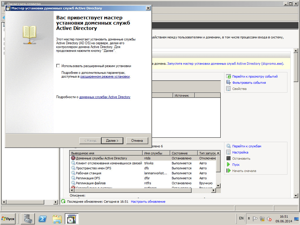 Дальше нас поприветствует мастер установки Active directory. Нажимаем Далее.