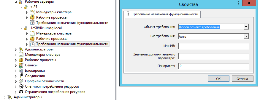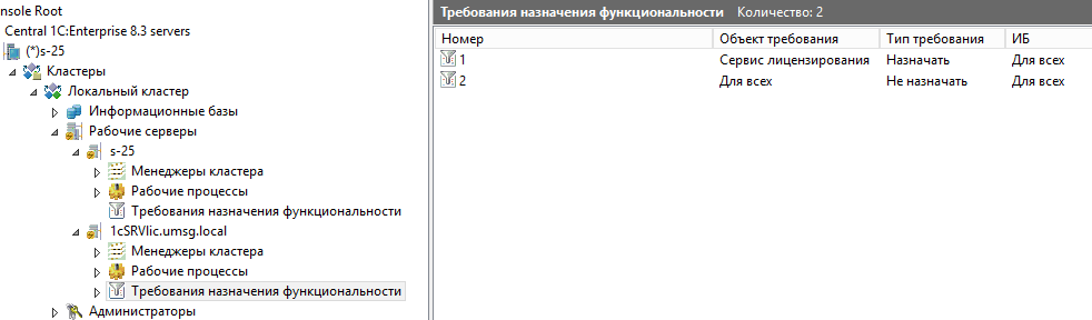 На остальных серверах кластера можно добавить требование для запрещения сервиса лицензирования. Открываем "Требования назначения функциональности". Добавляем две функциональности:
