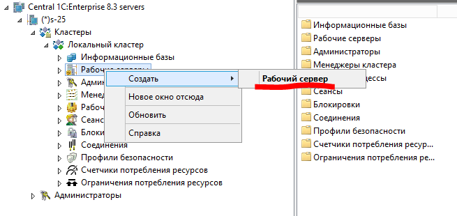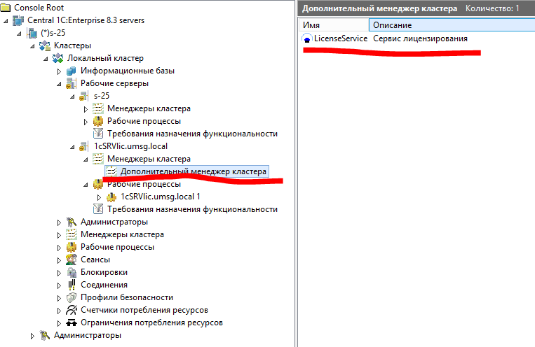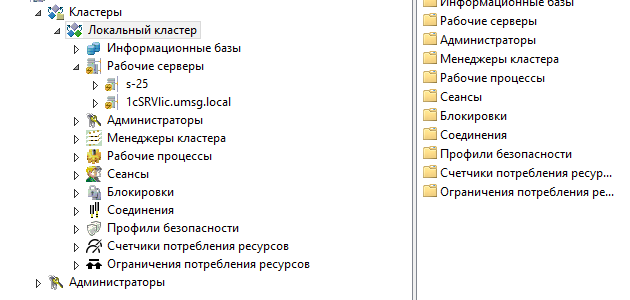 Далее идём на сервер приложений в консоль администрирования 1С. Переходим в кластер. Подробнее про создание кластера напишу в отдельной статье: