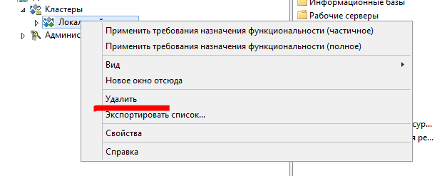 Из консоли администрирования 1С удаляем автоматически созданный локальный кластер. В дальнейшем мы добавим сервер лицензирования в существующий кластер 1С.