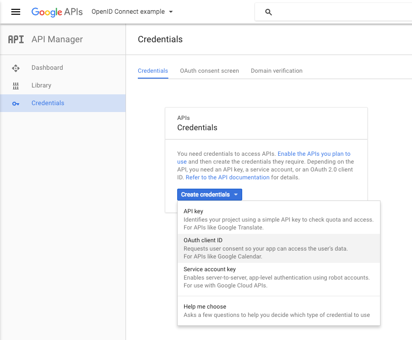 Теперь вам нужно сгенерировать некоторые учетные данные для вашего приложения, чтобы мы могли получить необходимые CLIENT_ID и CLIENT_SECRET. Нажмите «Учетные данные» на левой панели и, если необходимо, выберите свой проект. Затем вы можете создать учетные данные для своего проекта. Для веб-сайта ASP.NET Core вам потребуется выбрать параметр идентификатора клиента OAuth: