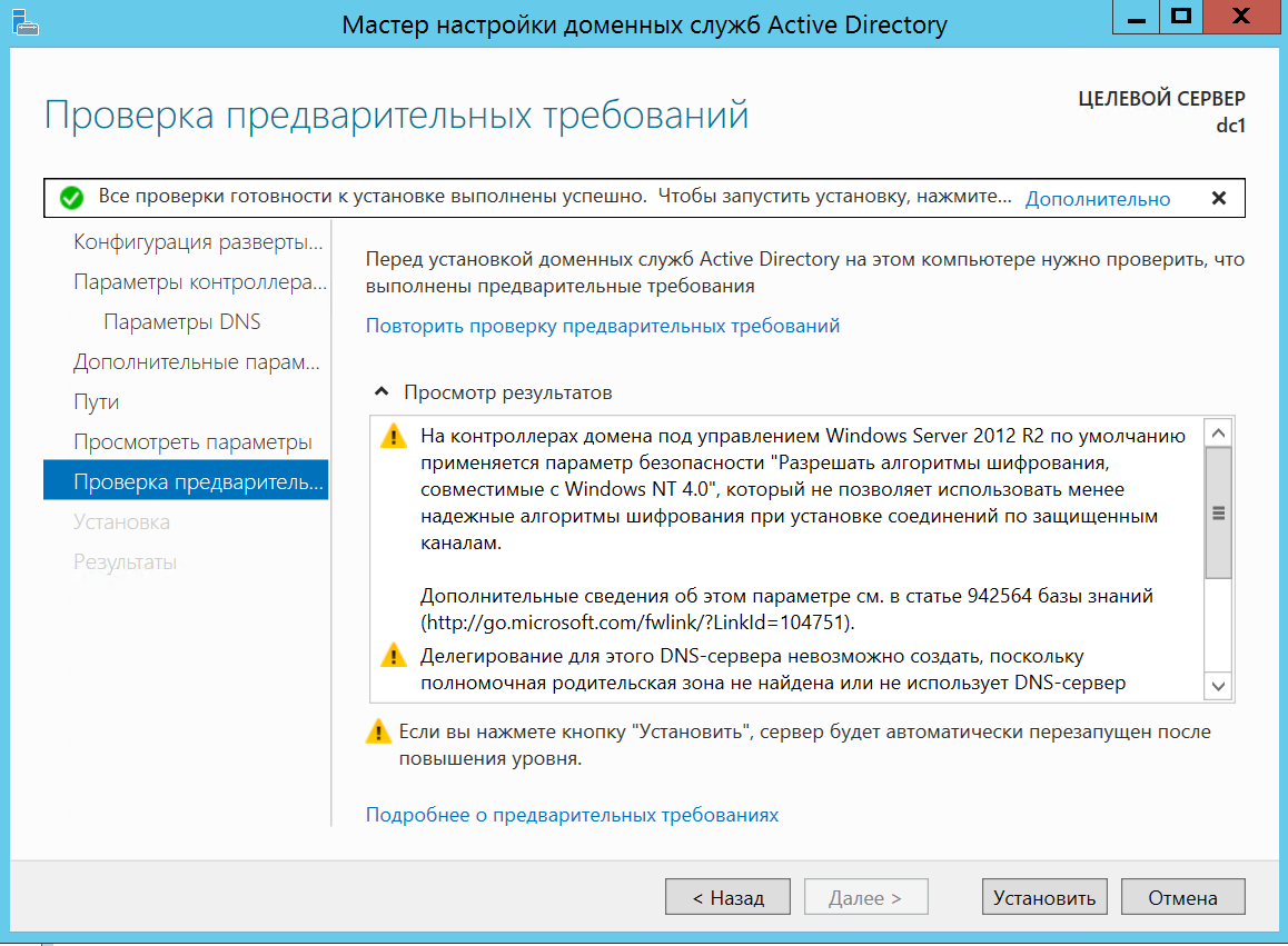 Дожидаемся выполнения предварительной проверки и если проверка прошла успешно, то мастер нам сообщит об этом: All prerequisite checks are passed successfully. Click «install» to begin installation. (Все предварительные проверки пройдены успешно. Нажмите кнопку «установить», чтобы начать установку.). Нажимаем Install.