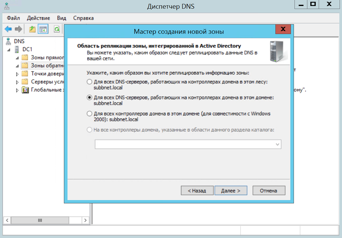 - To all domain controllers specified in the scope of this directory partition — Репликация на все контроллеры домена, но DNS-зона располагается в специальном каталоге приложений. Поле будет доступно для выбора, после создания каталога.
