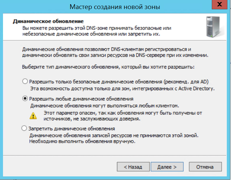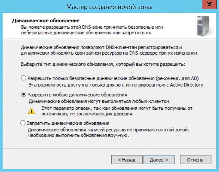 - Allow both nonsecure and secure dynamic updates — Разрешить любые динамические обновления, как безопасные так и нет.