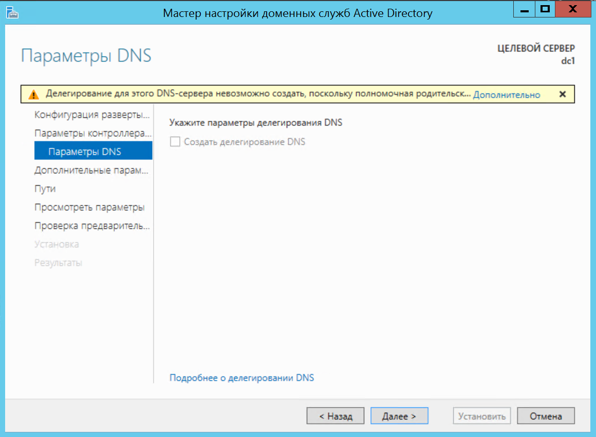 Не обращаем внимание на предупреждение ошибки делегирования для этого DNS-сервера, т.к. роль DNS поднимается в процессе конфигурации AD DS. Нажимаем Next.