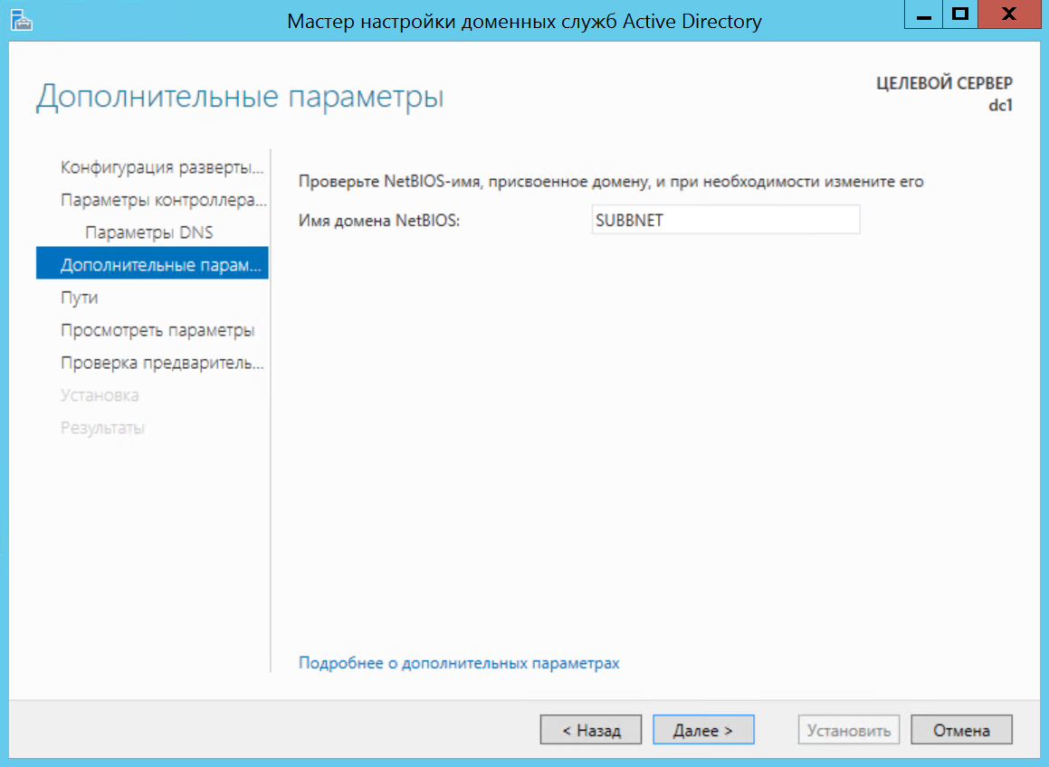 Оставляем подставленное мастером NetBIOS имя. Нажимаем Next.