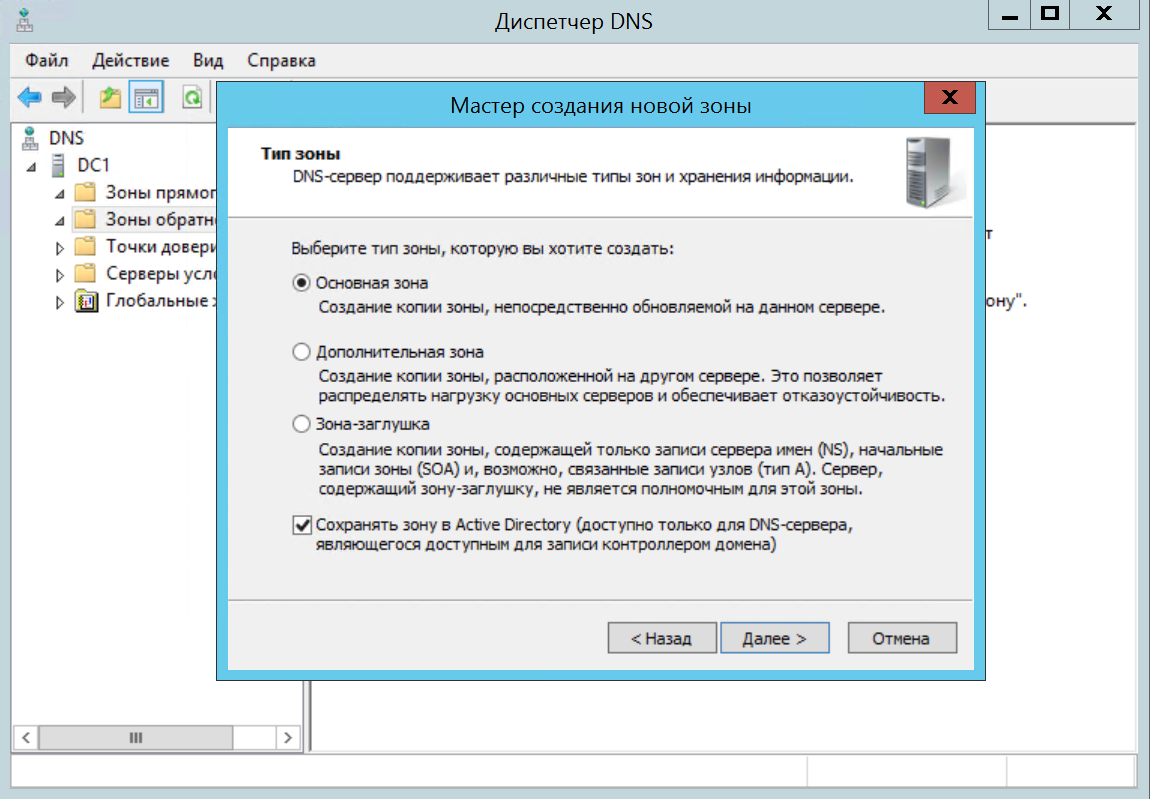 - Stub zone — Зона заглушка. DNS-сервер становится источником сведений только о полномочных серверах имен для этой зоны.