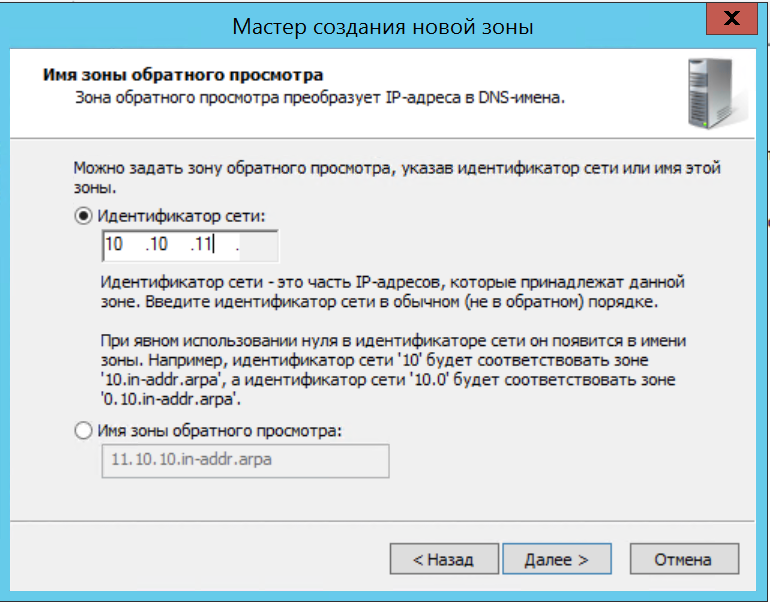Задаем параметр Network ID. В моем случае 192.168.0. В поле Reverse Lookup Zone Name автоматически подставится адрес зоны обратного просмотра. Нажимаем Next.