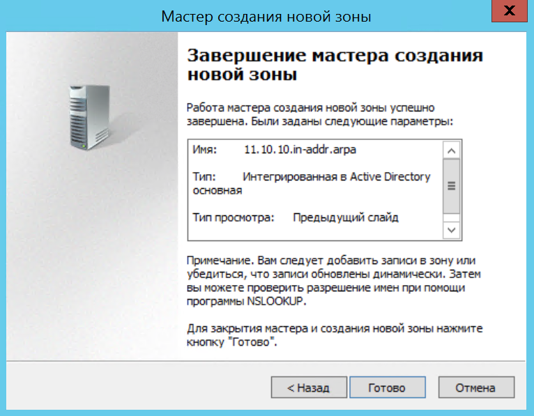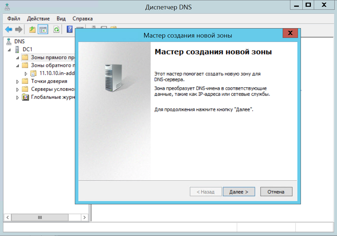 В ходе установки конфигурации AD DS, система будет перезагружена. После перезагрузки добавим зону обратного просмотра в DNS. Зоны обратного просмотра служат для разрешения IP-адресов в имена устройств.