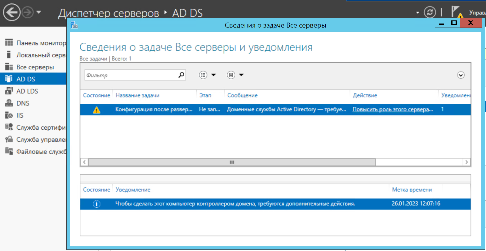 После установки Роли, в Server Manager нажимаем на значок Флажка с восклицательным знаком и выбираем Promote this server to a domain controller (Повысить этот сервер до контроллера домена). Запустится мастер конфигурирования AD DS.