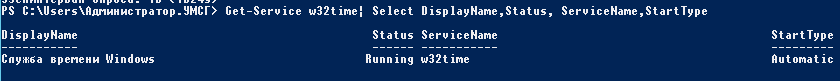 Get-Service w32time| Select DisplayName,Status, ServiceName,StartType