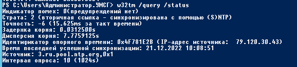 Проверьте, что ваш компьютер успешно получил время с нового источника времени (NTP сервера):