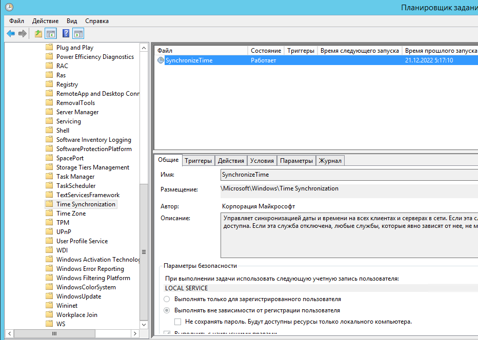 Для автоматической синхронизации времени в Windows используется отдельно задание в планировщике Task Scheduler. Запустите консоль taskschd.msc и перейдите в раздел Task Scheduler (Local) -> Task Scheduler Library -> Microsoft -> Windows -> Time Synchronization. Проверьте, что задание SynchronizeTime включено.