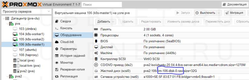 Для начала нужно посмотреть и найти диск виртуальной машины Proxmox, который мы будем конвертировать. Это можно сделать в веб-интерфейсе, перейдя на виртуальную машину, вкладку Hardware:
