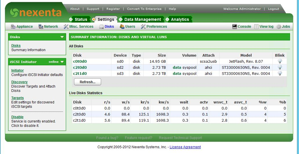 Так же у Nexenta переодически бывает «болезнь» — перестает отвечать Web-интерфейс, при этом все остальные сервисы функционируют нормально. Решение имеетсяhttp://www.nexentastor.org/boards/2/topics/2598#message-2979