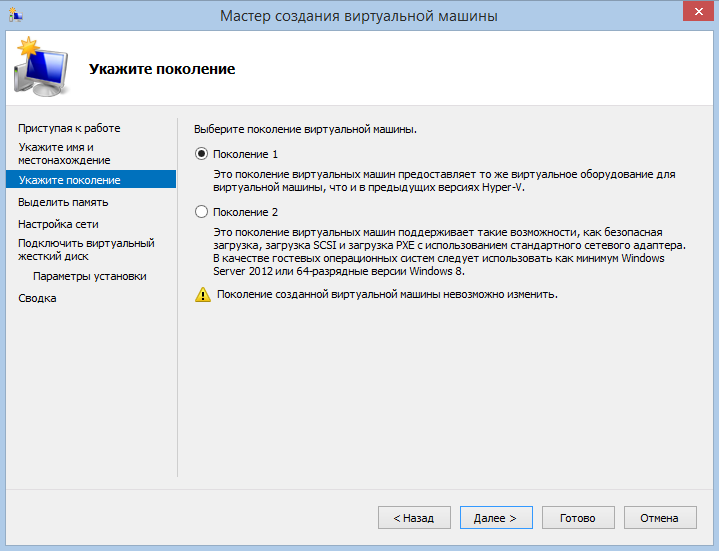 Затем указываем поколение ВМ — первое или второе. Второе поколение ВМ появилось только в последней версии Hyper-V и имеет ряд особенностей, которые описаны в отдельной статье. Я же напомню, что в качестве гостевой операционной системы в ВМ второго поколения можно использовать только Windows 8\Windows Server 2012 и более новые, для всех остальных ОС выбираем первое поколение.