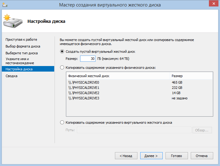 Производим настройку диска. По умолчанию создается пустой виртуальный диск указанного размера, также можно указать скопировать в него содержимое любого физического диска, подключенного с компьютеру, или скопировать содержимое другого виртуального диска.