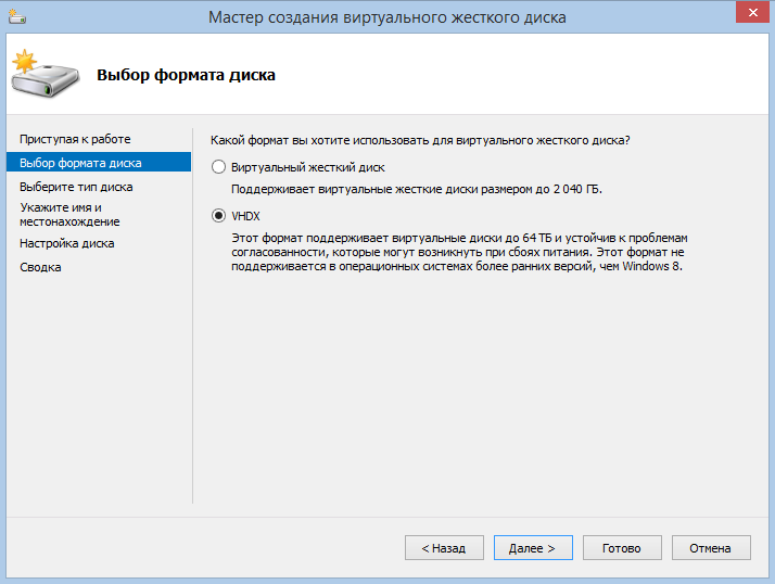 Выбираем формат создаваемого диска. По умолчанию выбран новый формат VHDX, и если вы не планируете переносить диск на другой компьютер или сервер, то лучше его оставить. Формат VHD стоит использовать исключительно для обеспечения совместимости с предыдущими версиями Hyper-V, так как VHDX поддерживается только в Windows Server 2012\Windows 8 и выше.