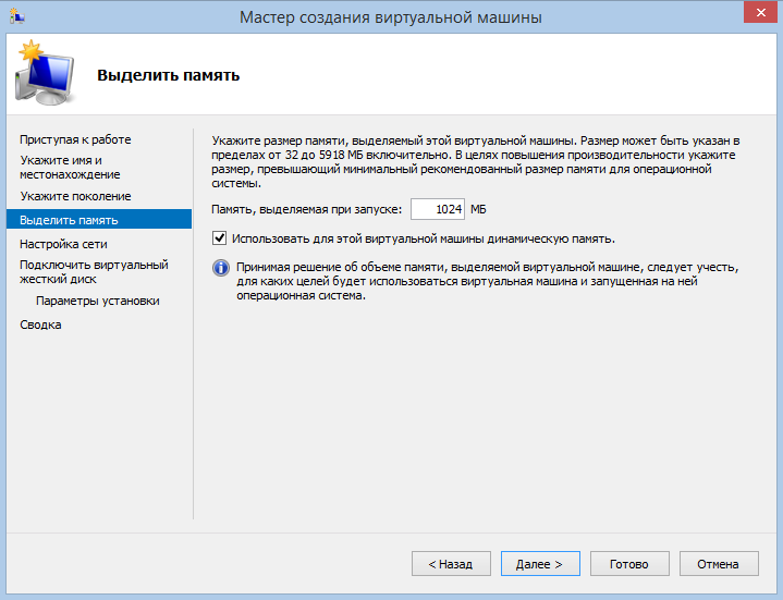 Дальше задаем количество оперативной памяти, выделяемое машине при старте и указываем, будет ли использоваться механизм динамической памяти. Более тонкую настройку памяти можно произвести позднее, после создания ВМ.