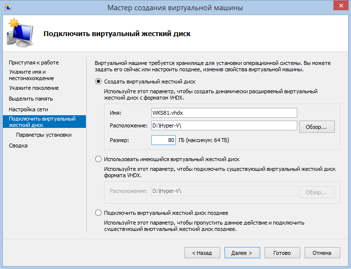Задаем имя, размер и расположение виртуального жесткого диска для ВМ. Обратите внимание, что по умолчанию создается динамический диск формата VHDX, и если вы хотите указать другой тип диска, то надо будет создать и подключить его позднее. Также к ВМ можно подключить уже имеющийся VHD.