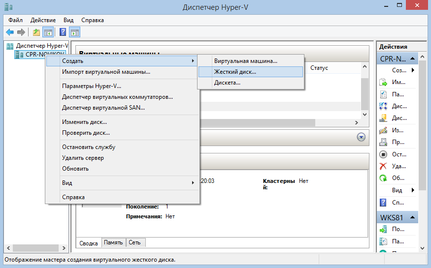 Как было сказано выше, при создании ВМ доступен только один тип виртуального диска — динамически расширяемый, формата VHDX. Если же требуется что-то другое, то придется создавать диск отдельно, с помощью специального мастера. Для этого в контекстном меню выбираем пункт Создать -> Жесткий диск.
