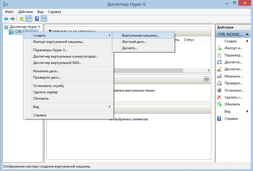 Для создания виртуальной машины в графической оснастке кликаем правой клавишей на имени хоста и выбираем Создать -> Виртуальная машина.