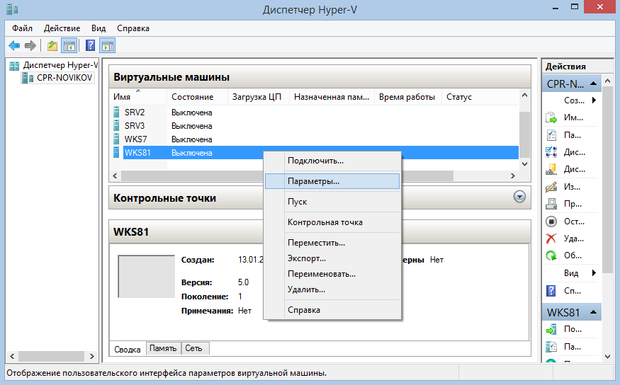 То же самое можно проделать и с помощью команд РowerShell. Для создания виртуальной машины воспользуемся командлетом New-VM. Следующей командой мы создадим виртуальную машину первого поколения WKS81, выделим ей 2ГБ ОЗУ, подключим к внутренней сети и создадим для нее новый диск размером 30ГБ: