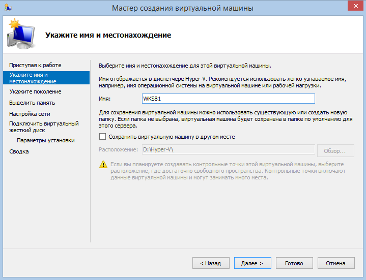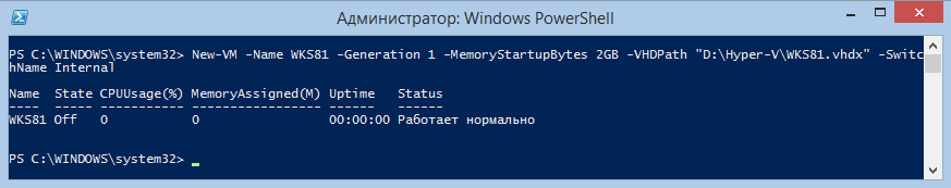 New-VM -Name WKS81 -Generation 1 -MemoryStartupBytes 2GB -VHDPath ″D:\Hyper-V\WKS81.vhdx″ -SwitchName InternalА этой командой мы создадим ВМ без виртуального диска, с тем чтобы подключить его позднее: