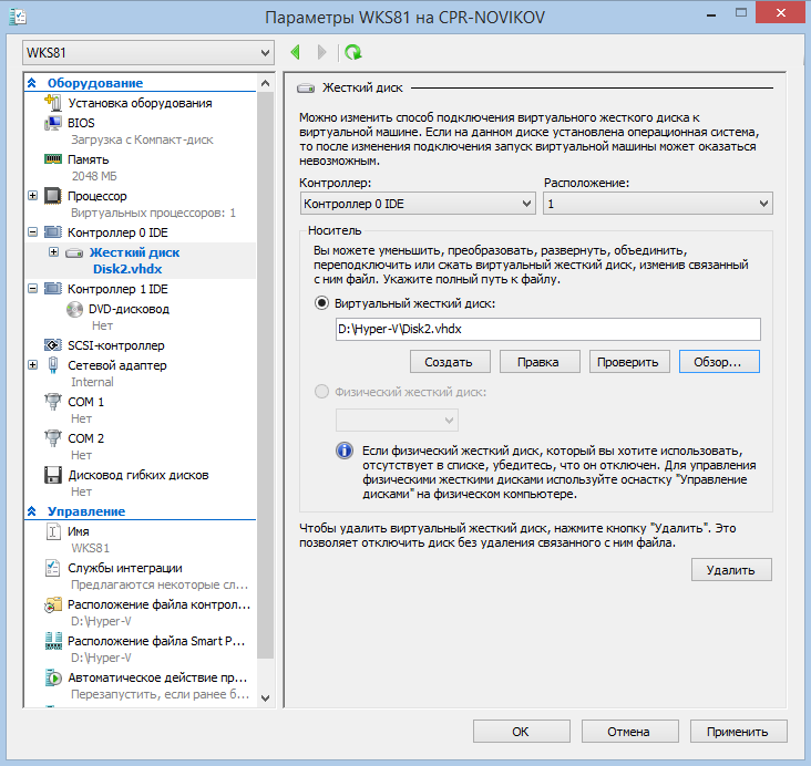 New-VHD -Path ″D:\Hyper-V\Disk2.vhdx″ -SizeBytes 30GB -FixedИ подключим этот диск к IDE-контроллеру командой: