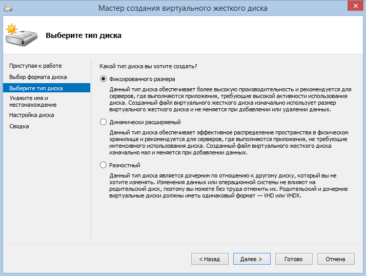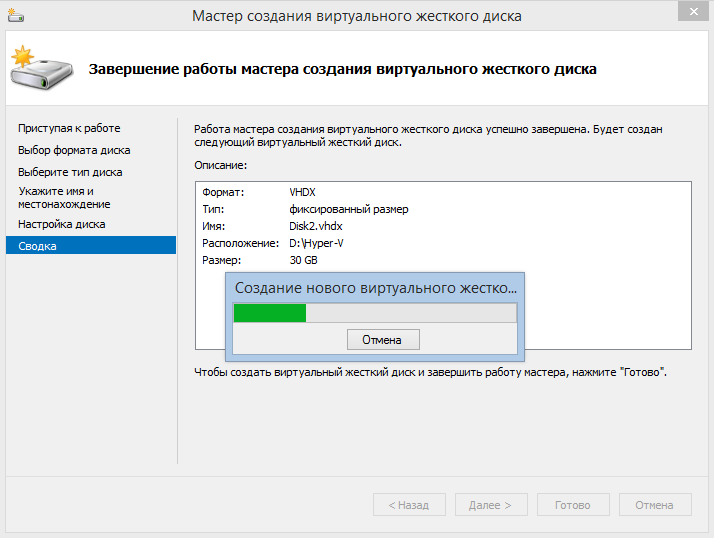 В завершение проверяем получившиеся настройки и жмем «Готово». Время создания диска зависит от выбранного типа — динамический диск создается моментально, а фиксированный придется подождать.