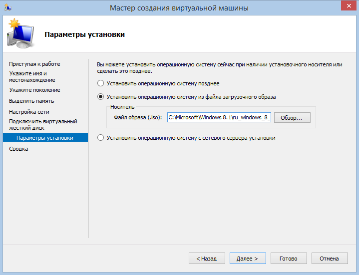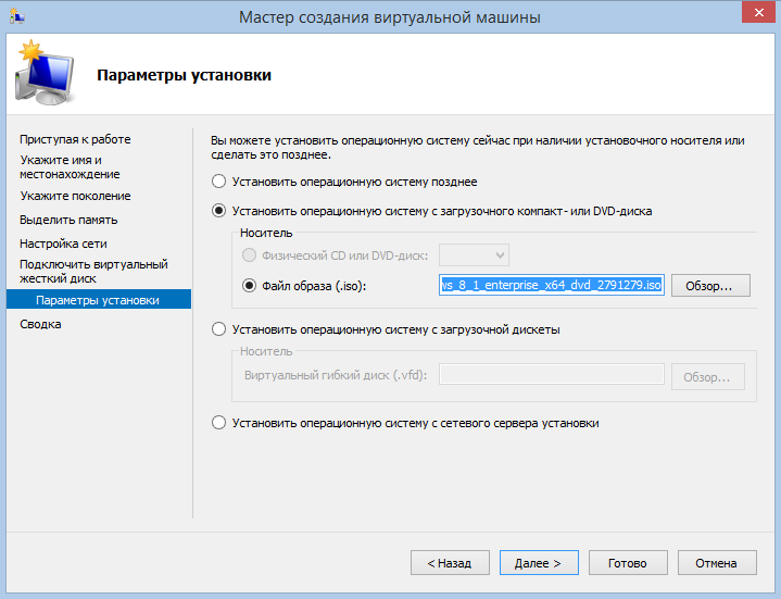 Указываем носитель, с которого будет устанавливаться операционная система. Здесь в зависимости от поколения ВМ есть некоторые различия. Для первого поколения ВМ можно указать установку из файла образа, физического носителя или с сервера установки.