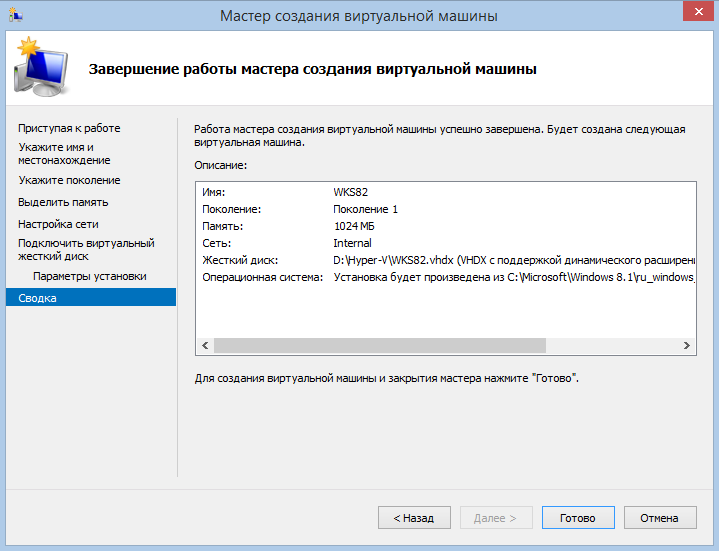Проверяем получившиеся настройки и жмем «Готово», запуская процесс создания ВМ.