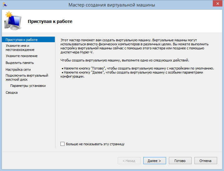 Запускается мастер создания виртуальной машины. В принципе для создания новой машины достаточно на первой странице мастера нажать кнопку «Готово», при этом будет создана виртуальная машина с дефолтными настройками и именем ″Новая виртуальная машина″. Для более детальной настройки параметров новой ВМ жмем кнопку «Далее».
