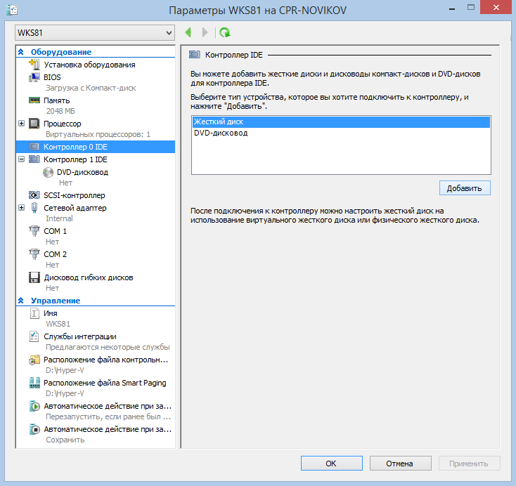 Дальше выбираем дисковый контроллер, выделяем пункт «Жесткий диск» и жмем кнопку «Добавить». Выбор контроллера зависит от назначения диска и поколения ВМ. Для машин первого поколения диск, с которого будет производиться загрузка системы, можно подключать только к IDE контроллеру, а диски общего назначения — к любому контроллеру IDE или SCSI. У второго поколения ВМ контроллер IDE отсутствует и все диски подключаются только к SCSI.