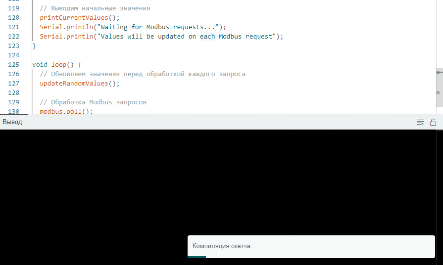 ModbusRTUSlave modbus(Serial); // Объект для работы с Modbus RTUholdingRegisters— массив для хранения значений, доступных по Modbus.modbus— объект библиотекиModbusRTUSlave, отвечающий за обработку запросов.